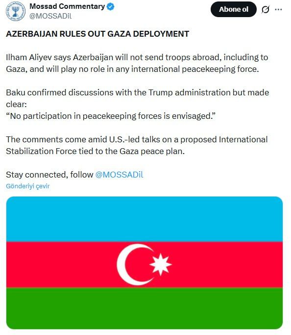 Bəyanatda vurğulanıb ki, Azərbaycan Qəzza da daxil olmaqla, silahlı qüvvələrini ölkə xaricinə göndərmək niyyətində deyil və heç bir beynəlxalq sülhməramlı qüvvələrdə iştirak etməyi planlaşdırmır.